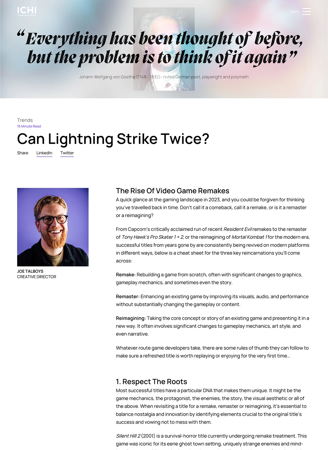 The goal of the blog was to both showcase ICHI as a thought leader with its finger firmly on the pulse of the gaming and creative industries and also provide a place for the team behind the work to share their opinions and ideas and give an insight into what it's like to work at ICHI.